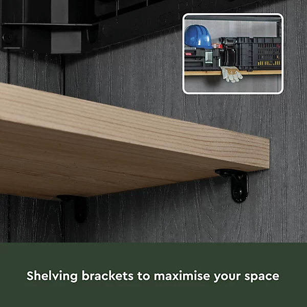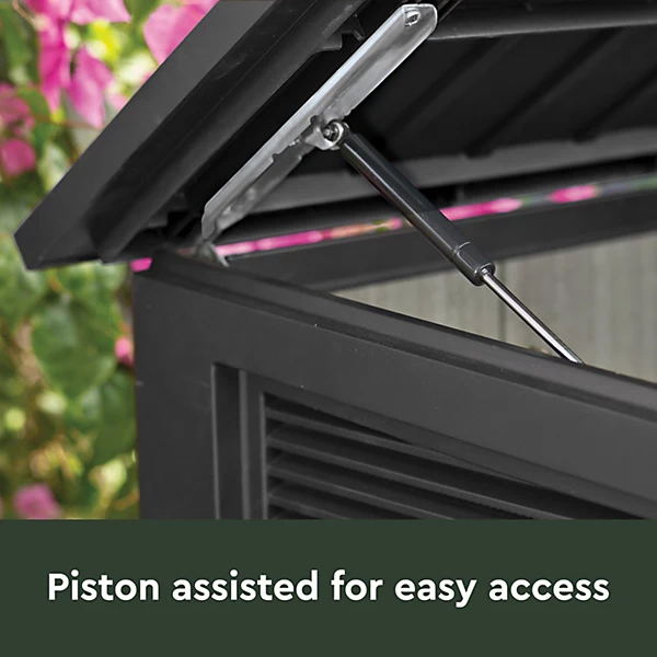 his premium shed’s walls provide the rustic, true-to-life look of natural walnut wood, yet they’re made from an innovative material that’s weather resistant, requires no maintenance, and won’t rust, fade, dent, or peel. Easy to assemble, this unit’s 2020L of space can easily fit bicycles or two 360L or three 240L wheelie bins. Adjustable brackets can support wooden shelves for extra storage, and hydraulic pistons makes the top easy to open. And all your items can be secured behind double lockable doors. Built-in ventilation keeps the unit free from bad odours. Its natural walnut finish makes it a great addition to any driveway, patio, garden, or accommodating outdoor space.